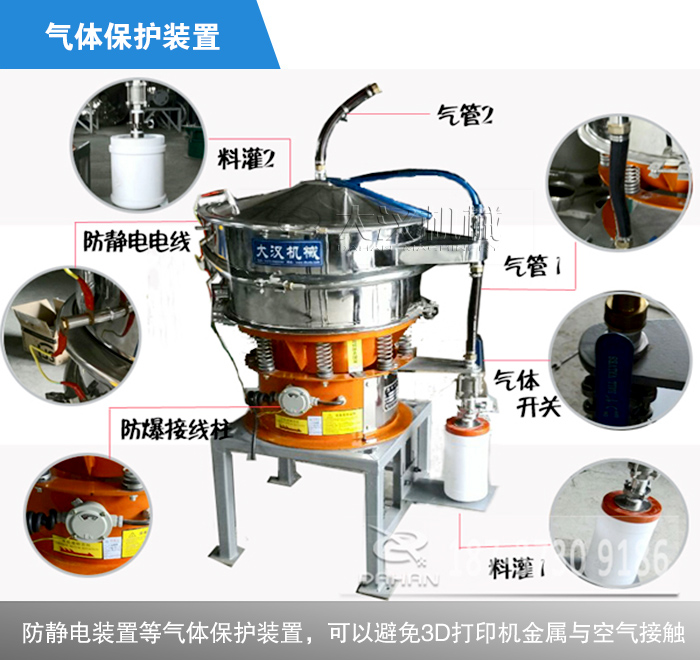 3D打印機(jī)金屬粉與空氣接觸易發(fā)生爆炸,在選擇振動(dòng)篩時(shí)這是用戶擔(dān)憂的一個(gè)問(wèn)題,所以對(duì)于振動(dòng)篩選型來(lái)說(shuō)是需要極其謹(jǐn)慎的。氣體保護(hù)振動(dòng)篩機(jī)是針對(duì)某些物料的特性加裝的,比如有些物料不能接觸氧氣,二氧化碳等等,采用氣體保護(hù)軟管,防靜電裝置等氣體保護(hù)裝置,可以避免3D打印機(jī)金屬與空氣接觸。