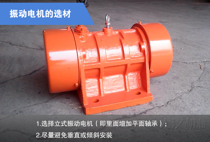 在選材上,盡量使用殼座一體的振動(dòng)電機(jī)(即地腳面在機(jī)殼上),因地腳面是一次加工而成,故能保證其水平。而殼座異體(即地腳面在兩端端蓋上),因地腳面是分次加工,再組裝而成,由于裝配誤差的存在,不易保證其地腳面的水平,這樣幾地腳螺栓的受力就不易均勻,而受力較大的一螺栓就容易松動(dòng),進(jìn)而引起其它螺栓的松動(dòng)、斷裂,燒毀電機(jī)。因?yàn)檎駝?dòng)電機(jī)兩端裝有較重的偏心塊,如垂直或傾斜安裝(即轉(zhuǎn)軸垂直或傾斜水平面),則軸承軸向要承受偏心塊的重力。如果振動(dòng)電機(jī)里無(wú)特殊裝置(即平面軸承),將對(duì)軸承產(chǎn)生不良影響,從而縮短使用壽命。