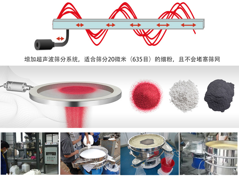 超聲波振動篩在普通篩機基礎(chǔ)上增加超聲波篩分裝置,超聲波振動篩振頻可達3.6萬次/秒,適合篩0-625目精細粉末,產(chǎn)量可提高0.5-10倍.