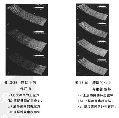 振動(dòng)篩分機(jī)的DEM仿真結(jié)果可以用于分析顆粒群再篩網(wǎng)上的松散度、振動(dòng)強(qiáng)度、料層厚度、篩孔孔徑和篩面傾角等參數(shù)對(duì)分離粒度及篩分效率的影響及相互作用。顆粒群再篩網(wǎng)上的流動(dòng)平衡、顆粒對(duì)篩網(wǎng)的沖擊速度計(jì)施加在篩網(wǎng)上的載荷也能通過DEM仿真結(jié)果獲得,從而確定篩網(wǎng)所受的應(yīng)力、篩網(wǎng)的磨損及篩分裝置的功率、圖12-39和圖12-40分別為Yuan等人通過DEM仿真獲得的篩網(wǎng)上的作用力圖和篩網(wǎng)的沖擊與磨損破壞圖。