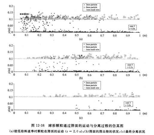 DEM仿真的過程信息能夠在線不同篩分工作條件下顆粒再篩面的運(yùn)動(dòng)、顆粒同篩面之間的碰撞過程、顆粒通過篩網(wǎng)的分離過程,反映了不同力度顆粒在篩面上運(yùn)動(dòng)形態(tài)的差異,再現(xiàn)不同篩分機(jī)工作條件下顆粒運(yùn)動(dòng)過程,較為真實(shí)的描述顆粒同篩面之間的碰撞過程。圖12-38為Li等人模擬2mm和8mm球形顆粒通過篩面的運(yùn)動(dòng)與分離過程圖。